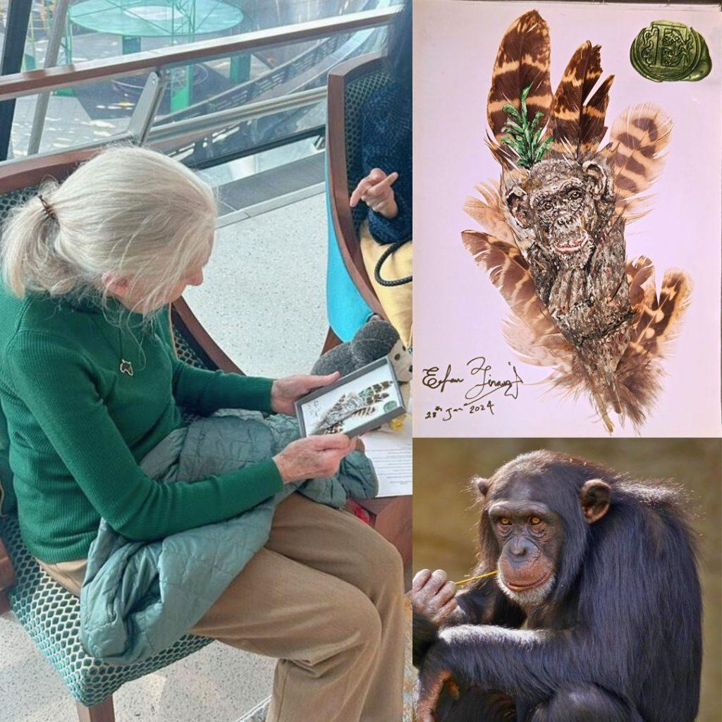 The choice of a feather was deliberate. A feather is light, easily broken, almost weightless in the palm. And yet, it carries flight, it carries journeys, it carries life itself. To me, it symbolized the ecosystems we fight to protect, so delicate they can shatter in an instant, yet so resilient they can endure if we care for them. And on it I painted the face of a chimpanzee, David Greybeard, because Dr Jane Goodall often said her favorite chimpanzee is a very special chimpanzee named David Greybeard! David was the very first individual to trust Jane when she began her observations in Gombe, Tanzania in 1960. From her, I had learned how to watch, how to wait, how to notice the personality in another being, how to see wonder in the smallest detail of life.