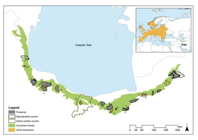 Map showing the locations of the 21 survey sites across the Hyrcanian forests in northern Iran (numbered 1–21) with the known extent of forest cover (derived from 1-km-resolution global land-cover data, adapted to a Hyrcanian forests map) overlaid; red-deer (Cervus elaphus maral) presence is indicated in grey shading across sites. The inset shows the broader IUCN-assessed distribution of the red deer species across its global range (orange).(Researchgate)