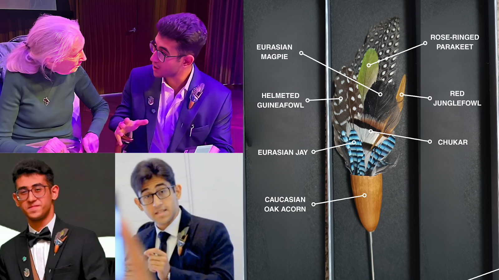 As you read further you will come across my campaign for these forests and their diversity, but I also regret the absence of Dr Jane Goodall to join me as Sir David Attenborough did. But I recall just months earlier, I shared the stories of this forest coincidentally, that was when I met a woman I have long admired: Dr. Jane Goodall in February 2025. Earlier when we met, I gave her a feather painting, later when she saw me to have our deep conversation, She looked and pointed out the brooch. I remember she traced its feather edge with gentle fingers. Asking me what's the story of this brooch. I responded by telling that this brooch carries a piece of the forests I have walked and loved. I collected a few feathers I found from birds in the Hyrcanian forests; Eurasian Jay, Helmeted Guineafowl, Red Junglefowl, Eurasian Magpie, Chukar, and Rose‑ringed Parakeet and carefully preserved them. I then attached them to a small Caucasian Oak acorn I had cut, creating a single pin. I wear it to carry the heartbeat of the forest, a fragile reminder of Nature’s beauty, resilience, and the urgent need to protect it. I also went into a little bit of details about the forests, things you have read so far.. Then, she said, in a quiet but firm voice:
