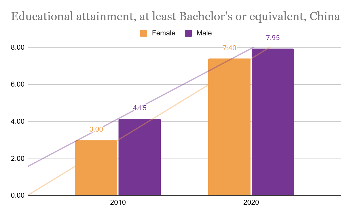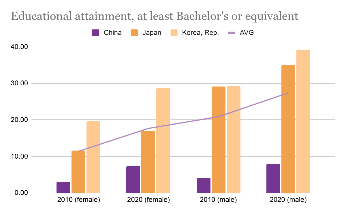 In 2010, female bachelor's degree attainment rates stood at 3.00% in China, 11.56% in Japan, and 19.68% in South Korea. Male rates were 4.15%, 29.14%, and 29.32% respectively.