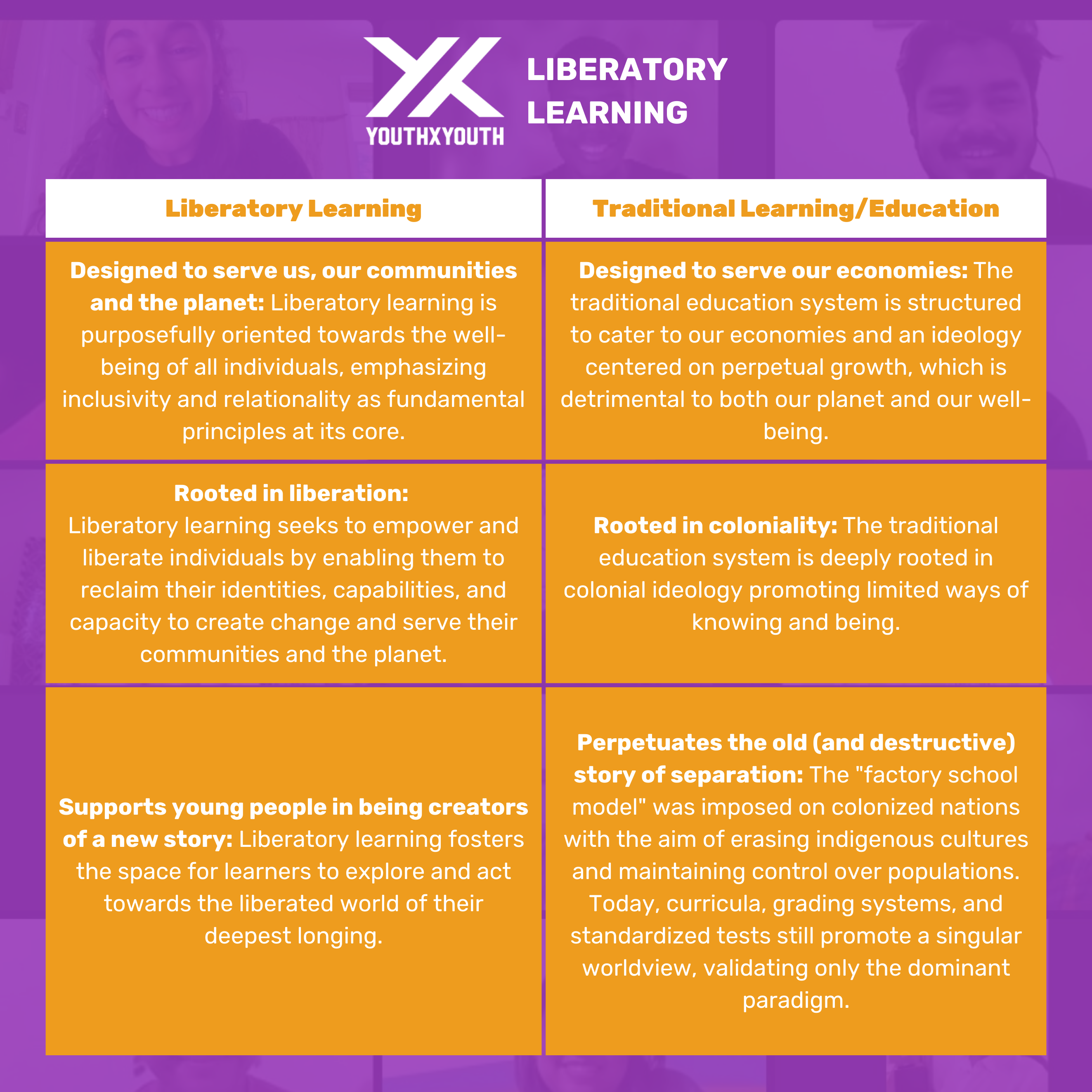 In our troubled times marked by social fractures, our education systems are failing to serve us, our communities, and the planet. The way of learning that they utilize f is monocultural and perpetuates the vicious cycles that uphold toxic systems such as patriarchy, capitalism, and neo-colonialism. It is imperative that we reclaim our sacred capacity to make sense of the world we live in, radically reimagine it, and take action towards our visions. Liberatory learning provides just that! Let's compare and contrast: