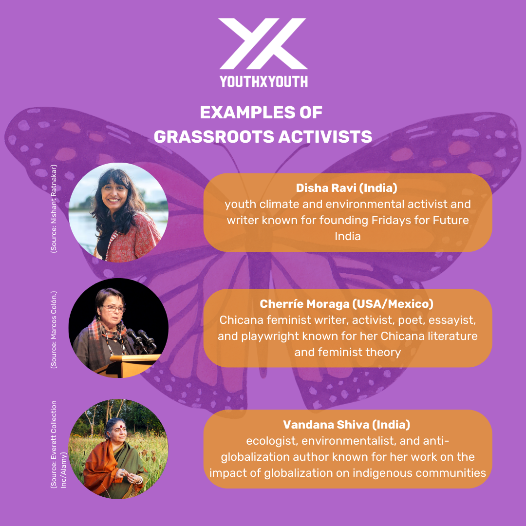 At YouthxYouth, a large part of our work is centred around the concept of glocality (The concept of rooting and collectively addressing local challenges with the support of global knowledge, resources and networks) which means Grassroots activism is intrinsically tied to our changemaking! So let’s explore it! Grassroots activists, or place-based activists, take action locally, whether in the workplace, schools, or neighbourhoods. It essentially emerges when ordinary people come together to address immediate issues affecting their lives.