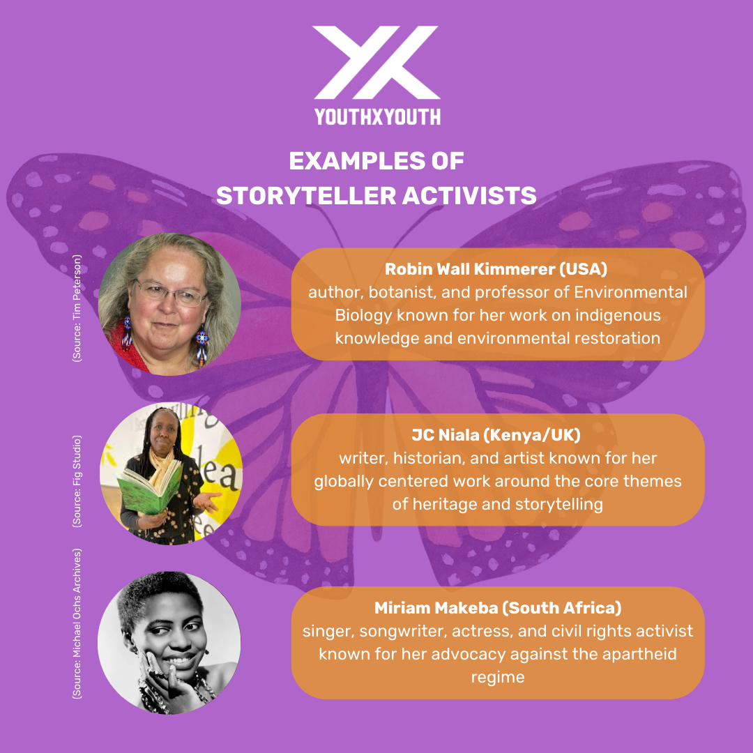 Storyteller activists use different mediums to share their stories with their communities and the world. These can include social media campaigns, writing, poetry, documentary, performance, song and public speaking. Storyteller activists can use their voice to speak up about injustices, write about hope and to create joy and move people with their stories.